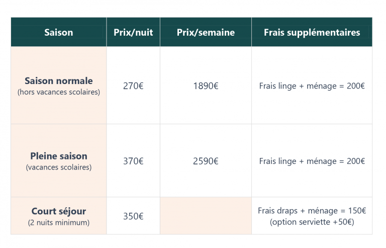 • Les draps sont inclus dans la prestation (avec le forfait ménage allant de 150 à 200 €)