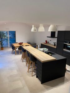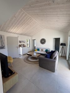 Elle dispose d’un salon spacieux avec télévision équipé d’un mobilier harmonieux et contemporain ouvert sur un espace cuisine – salle à manger moderne, comprenant un grand îlot pour cuisiner à votre aise, une cuisine entièrement aménagée et équipée, et une table carrée de 8 personnes pour des repas festifs et conviviaux.